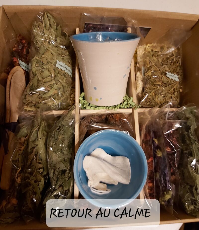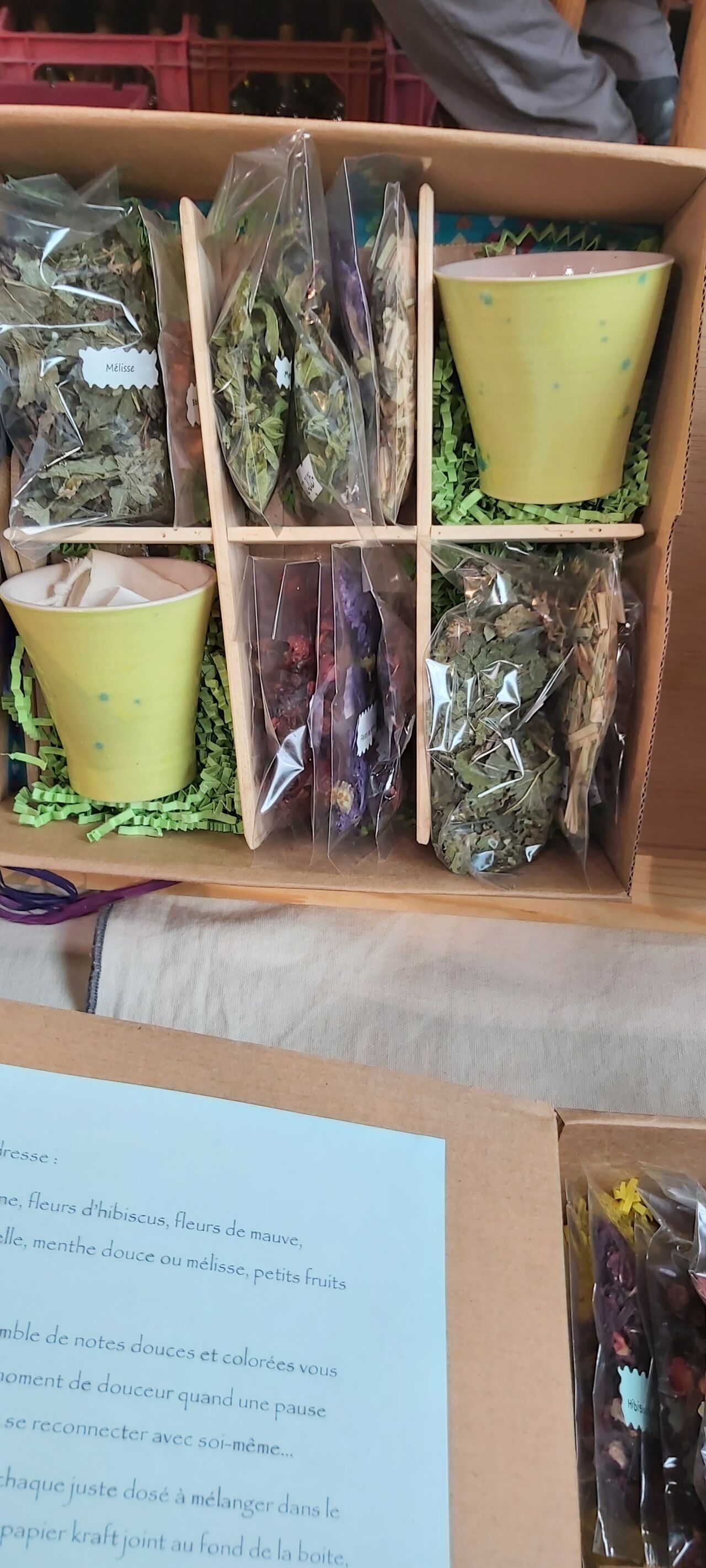 Mes coffrets en carton simple, sont décorés avec soin . Mes recettes sont unique , et elles sauront trouver leur place dans votre tasse. Soucieuse de l'impact environnemental j'utilise des matières recyclables, ainsi vous trouverez un filtre en coton bio réutilisable, des dosettes en papier naturel, petites cuillères en bambou .Certains coffrets sont garnis de tasses ou bols réalisés par une artisan potière pour une touche raffinée. Pour d'autres vous trouverez du miel de producteurs locaux avec qui je travaille. Je possède maintenant un stock de tasses et de bols que vous pourrez choisir sur photos lors de votre commande ou sur place sur mon stand.
