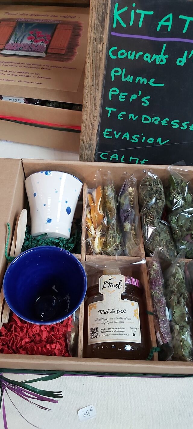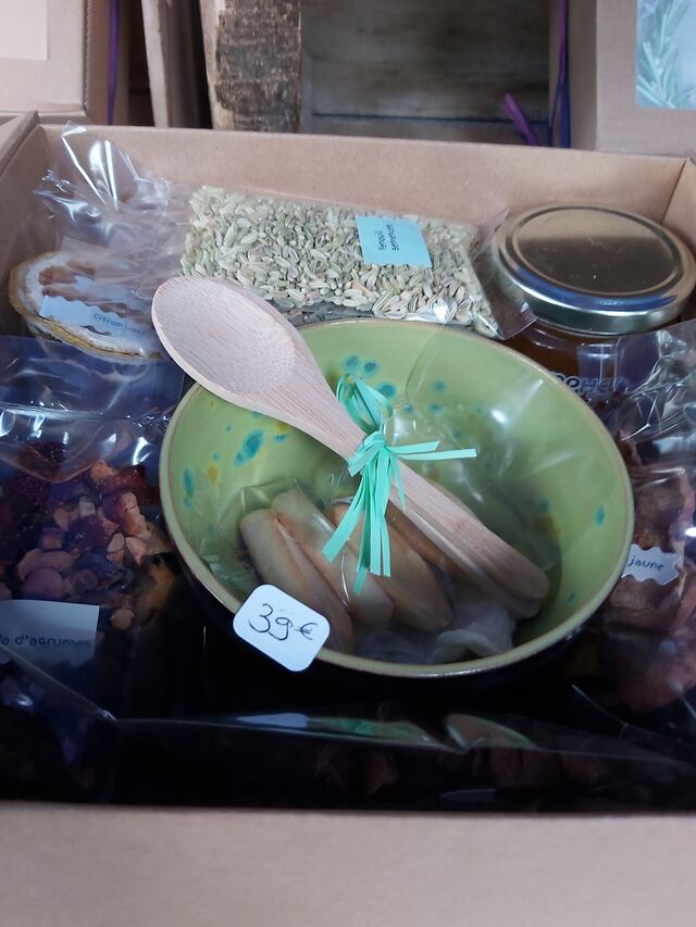 Chaque coffret est composé de 2 recettes. Des plantes avec leur nom commun, des épices, aromates correspondant à la recette, des conseils et un mode d'emploi, 2 tasses, ou 1 bols en terre émaillée, 1 miel, à la demande